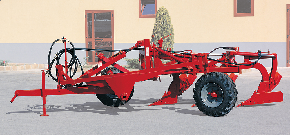 All’attacco a bandiera dell’aratro SERIE 2000 viene applicato un supporto con attacco a tre punti dove si aggancia il carrello. A questi viene applicato un braccio che sposta la ruota sinistra, con sistema pivottante, verso la parte posteriore ed a fianco all’aratro (non necessario nel Mod. AL 2V). In tal modo l’aratro non provoca spinte verso l’alto nella barra di traino della trattrice permettendo anche un raggio di sterzata molto ristretto e facilitando le manovre di retromarcia. Questo abbinamento permette al carrello di lavorare in asse con il trattore e quindi fuorisolco. Tale sistema permette di aumentare la produzione di almeno il 25%.