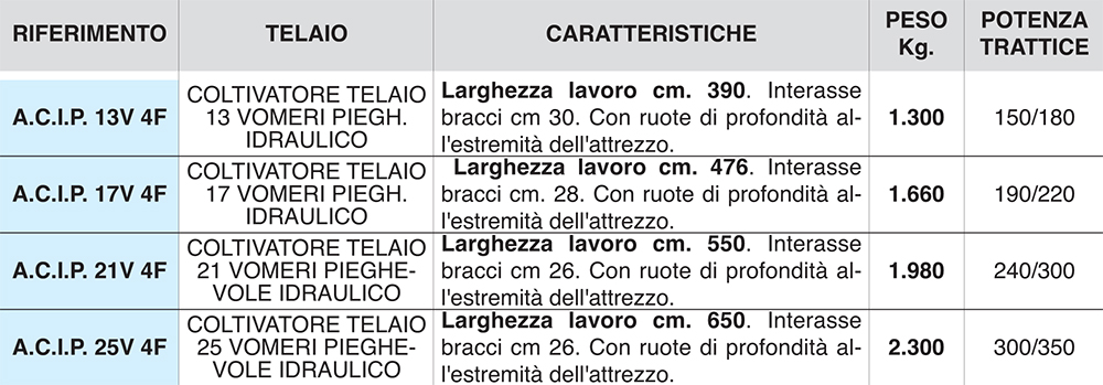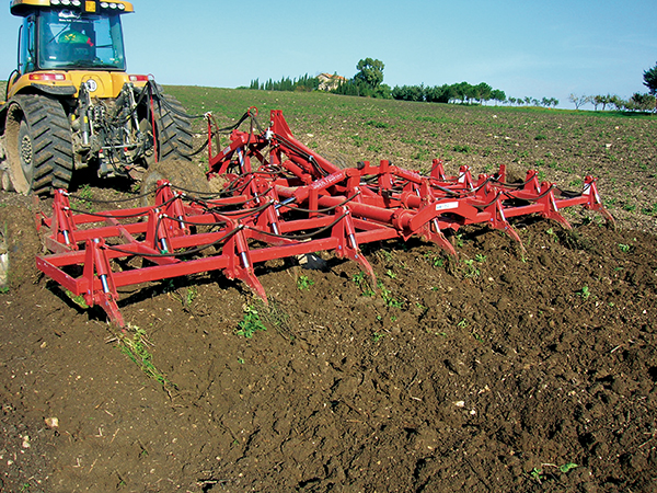 L’interasse degli utensili disposti a cm. 26 e a cm. 28, consentono di ottenere una lavorazione uniforme in tutta la larghezza dell’attrezzo. Grazie alla potenza di 250 Kg. nelle punte si possono ottenere profondità di lavorazione ottimali. La disposizione degli utensili a 4 file, oltre a permettere un eccellente lavorazione, consente all’attrezzo di lavorare senza alcuna difficoltà anche su terreni con quantità notevoli di residui vegetali. I bracci nelle singole traverse sono posizionate a cm. 104 o cm. 112, favorendo lo scorrere della terra e dei residui, questo fa sì che la terra lavorata rimane a cordoni per favorire il drenaggio delle acque piovane accorciando i tempi per asciugarsi. A richiesta nella traversa posteriore si possono applicare dei bracci flessibili in modo da dividere in due ogni singolo cordone di terra.